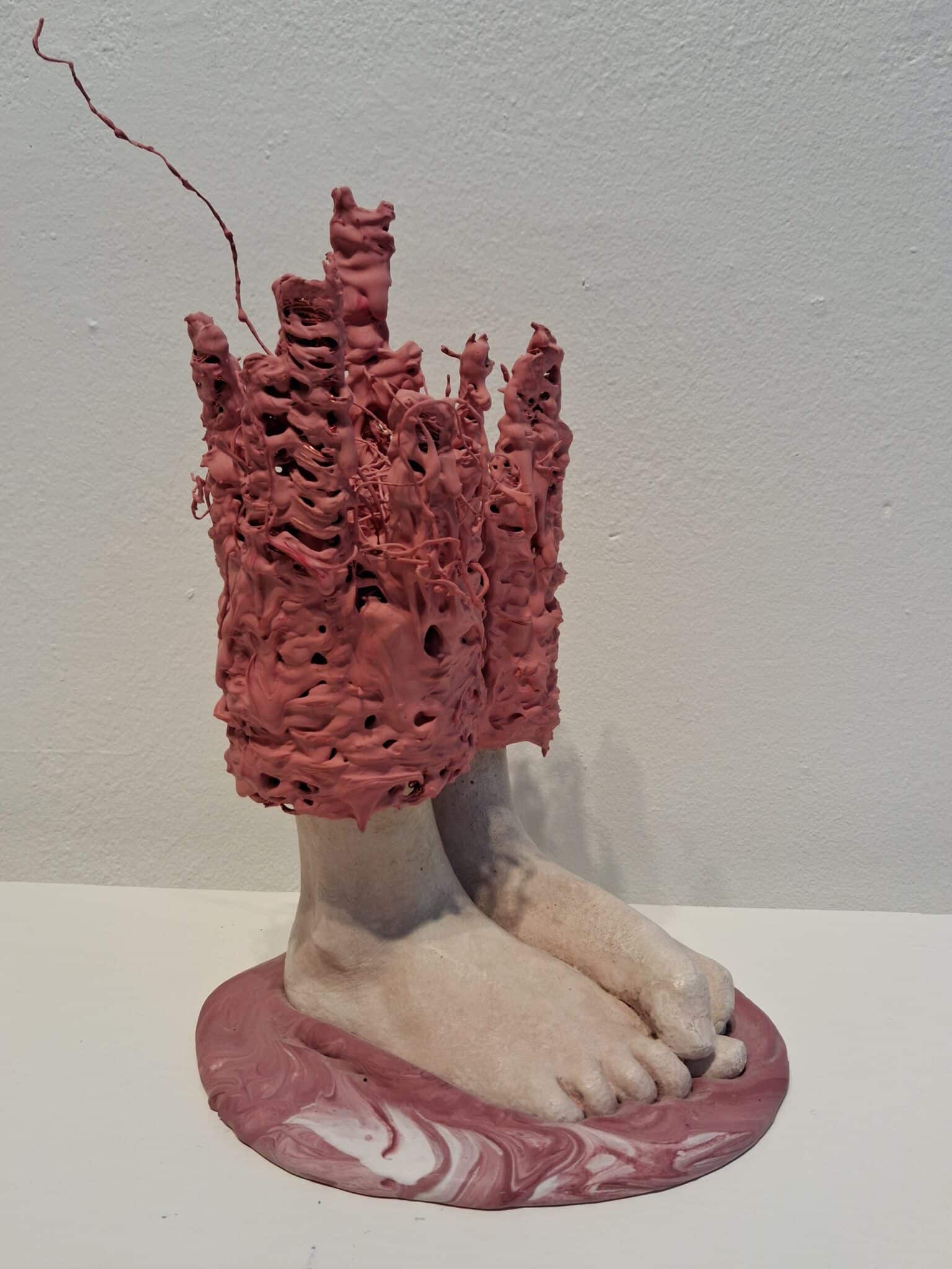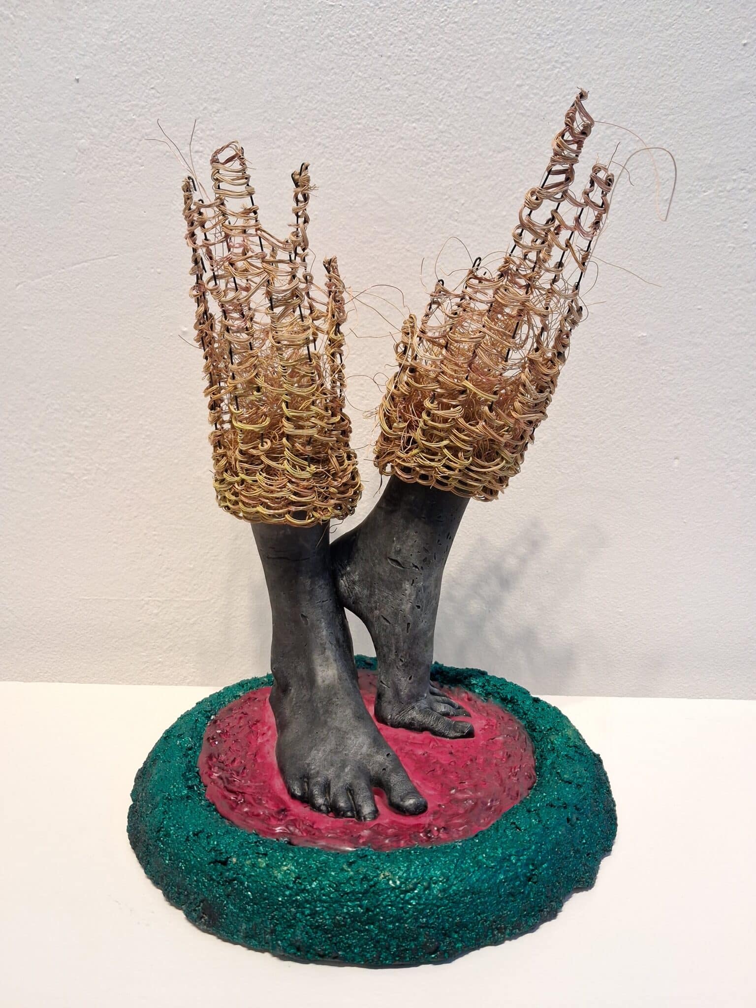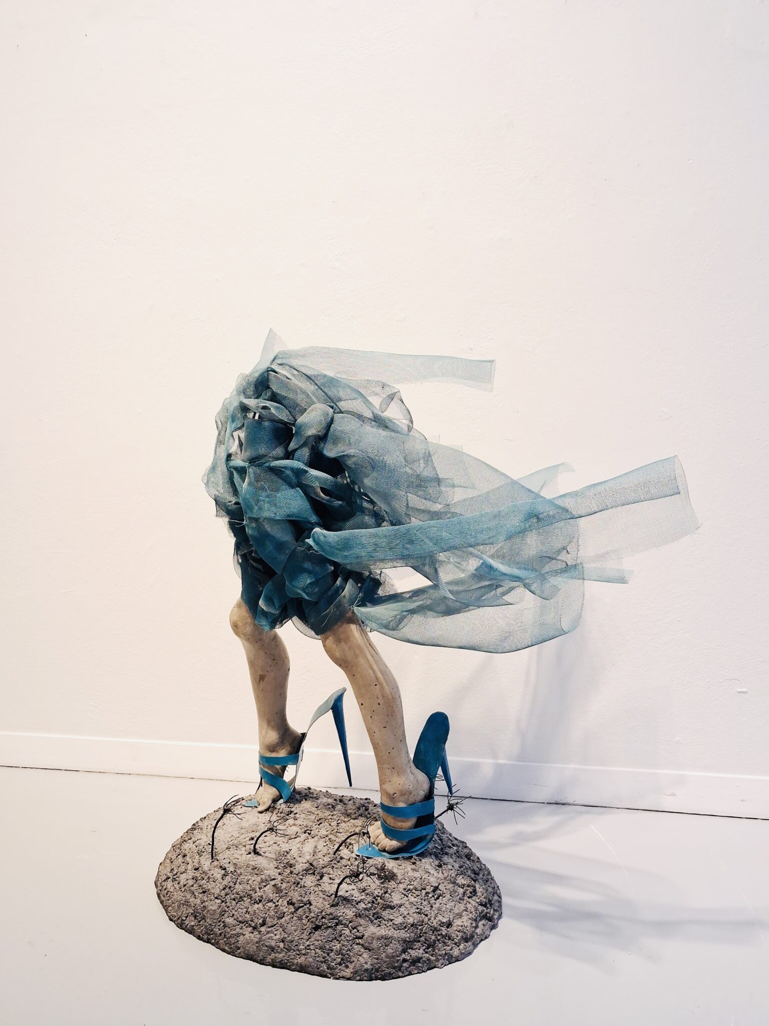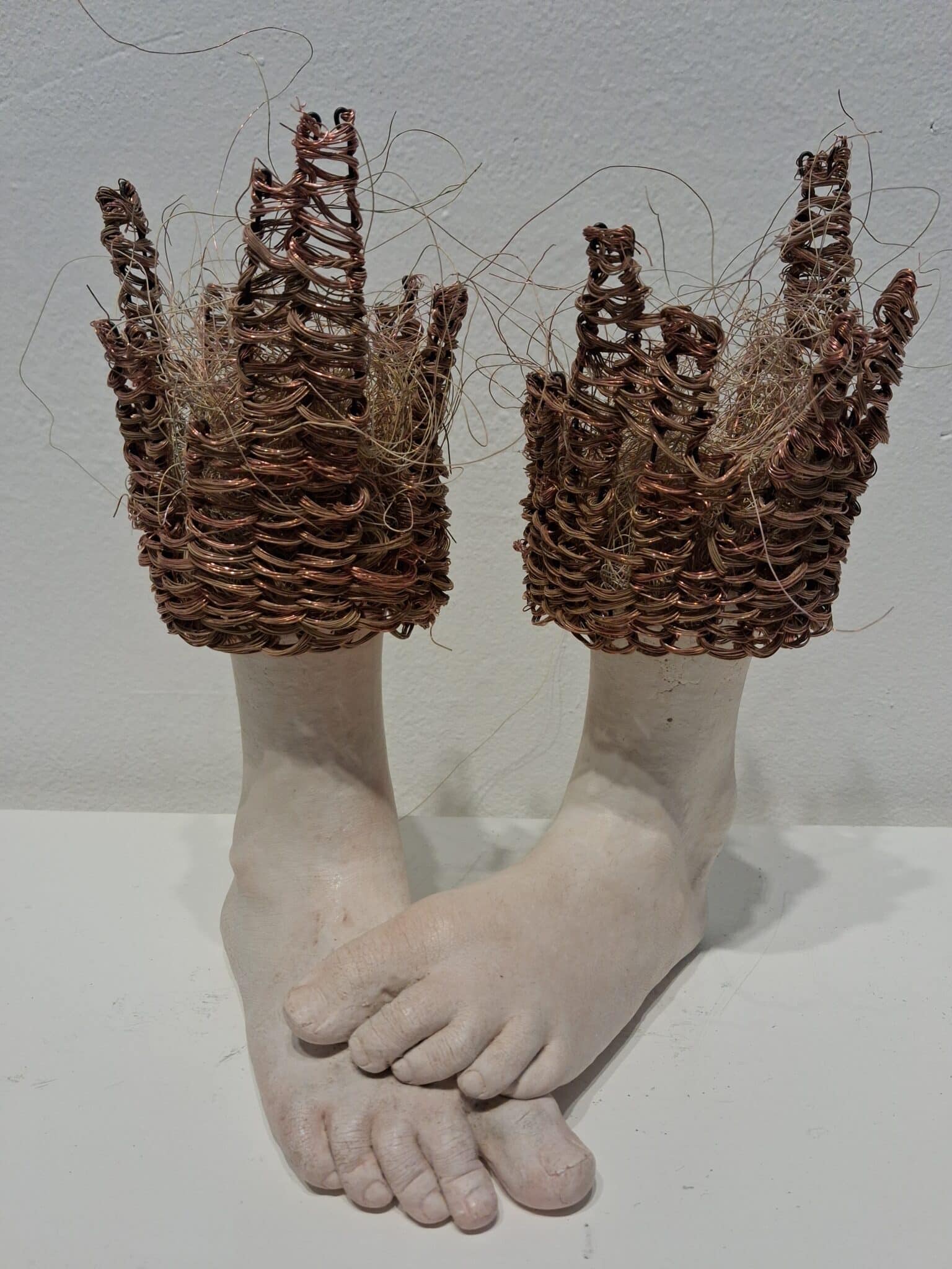 Lene Kilde creates sculptures inspired by children and their emotions. She finds that children’s body language is their purest form of communication. This is visualized by showing very few body parts, usually only hands and feet, which then are placed in proportion to each other with the use of metal mesh. Her intention is to invite the audience to use their own imagination so that they can complete the sculptures and fill in the lines and volume by themselves. The sculptures are made of concrete, metal mesh and air.